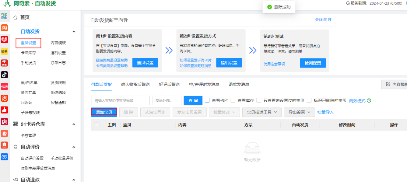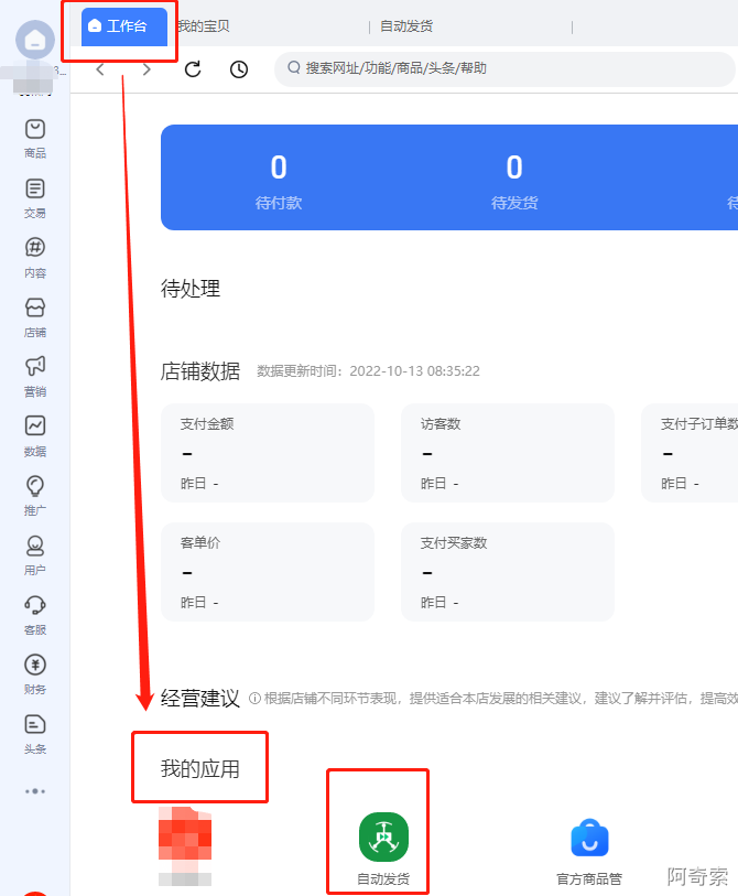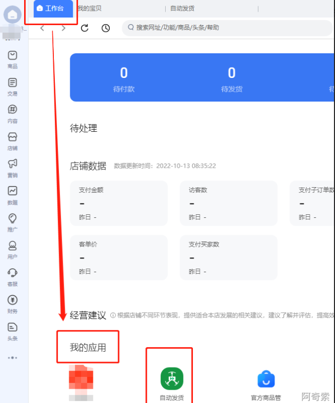 订购后,从千牛工作台下拉–我订购的应用—选择自动发货—进入阿奇索自动发货后台