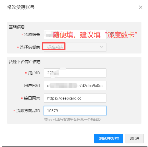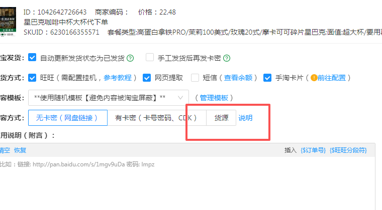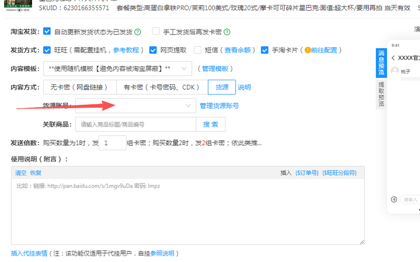 12.回到自动发货处,货源账号选择“深度数卡” ,也就是你上面添加的货源账号, 如果无法选择刚刚添加的账号,可联系阿奇索客服咨询